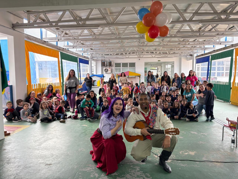 Para enaltecer a cultura gaúcha e celebrar a semana farroupilha, os alunos da Escola Municipal de Educação Infantil (Emei) receberam um show temático da escritora e contadora de história, Léia Cassol. A atividade contou com músicas, apresentação teatral, contação de histórias e atividades interativas.
