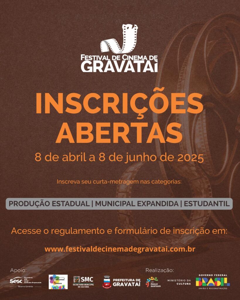 O Festival de Cinema de Gravataí acontecerá nos dias 28, 29 e 30 de agosto de 2025, no Teatro do SESC Gravataí. A programação completa será divulgada após o processo de curadoria, conduzido por profissionais da área audiovisual selecionados pela Comissão Organizadora.