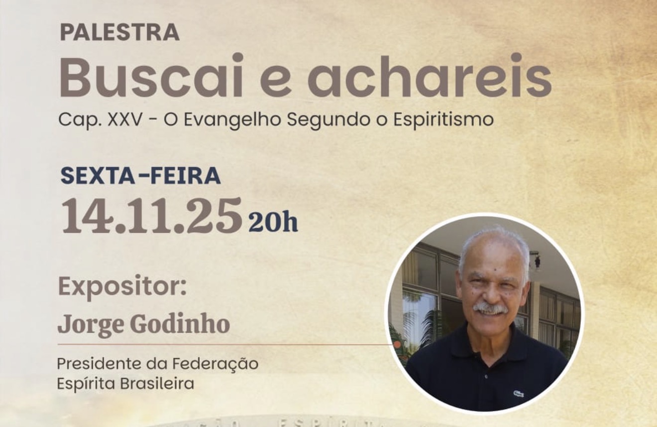 A palestra com o presidente da Federação Espírita Brasileira (FEB), Jorge Godinho, será realizada na sexta-feira, 14 de novembro de 2025, às 20h, na Sociedade Espírita Vinha de Luz, localizada na Rua Santa Rita de Cássia, nº 02, em Cachoeirinha. O tema do encontro será “Buscai e Achareis”, inspirado no Capítulo XXV de O Evangelho Segundo o Espiritismo.