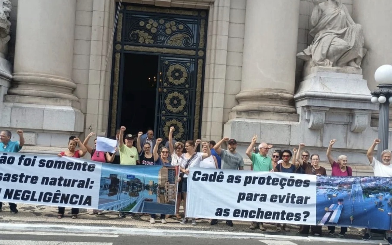 Um grupo de moradores de Cachoeirinha, atingidos pelas enchentes de maio de 2024, fizeram um protesto em frente à sede do governo do Estado protestando pela liberação de recursos do Funrigs (Fundo a Fundo da Reconstrução) em detrimento dos projetos para o sistema de contenção de cheias do município.